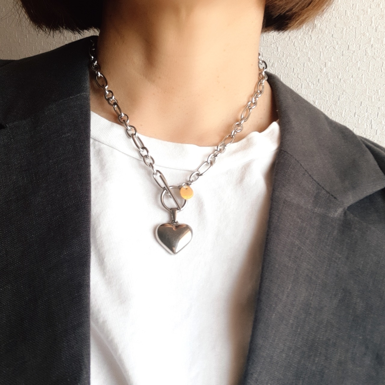 ぷっくりとしたハートとデザイン性の高いチェーンが目を引きます。