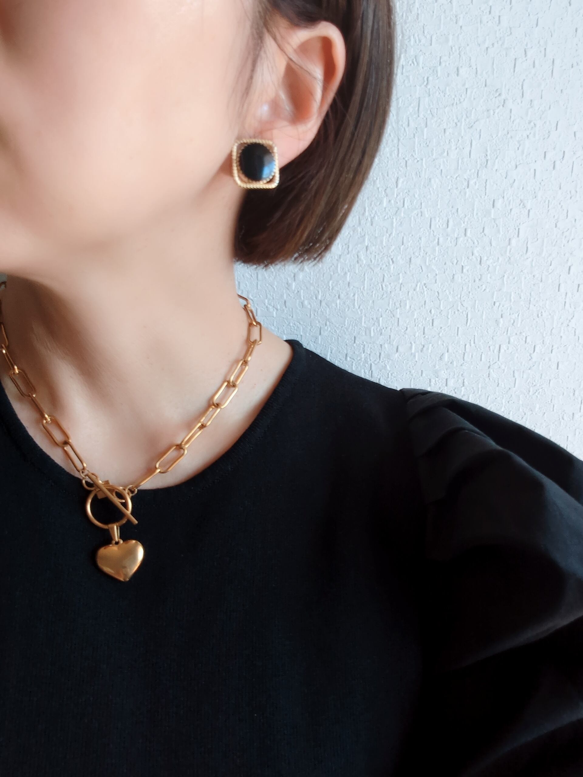 ブラックにゴールドフレームのスクエアボタンのイヤリング