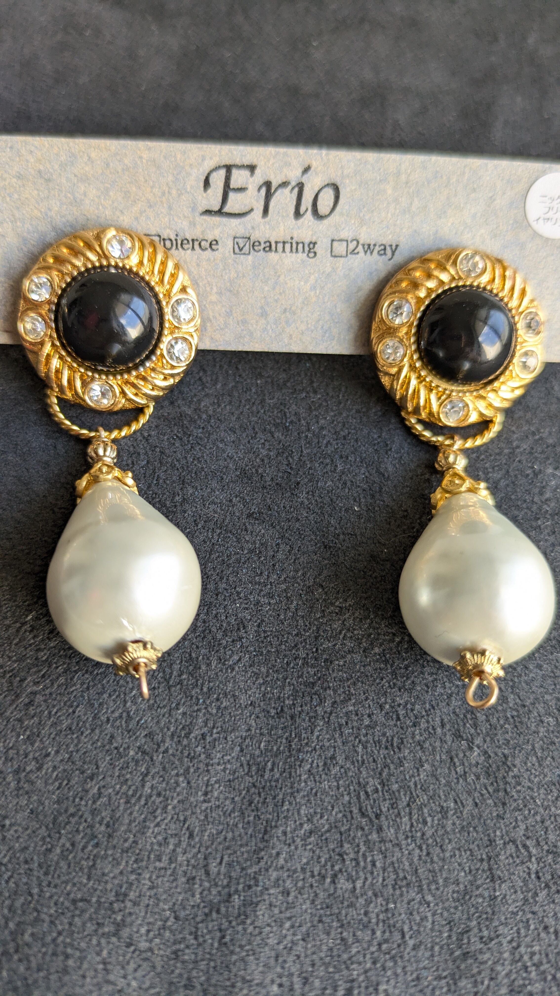 ブラックにゴールドフレームのラインストーンが華やかな印象のイヤリング