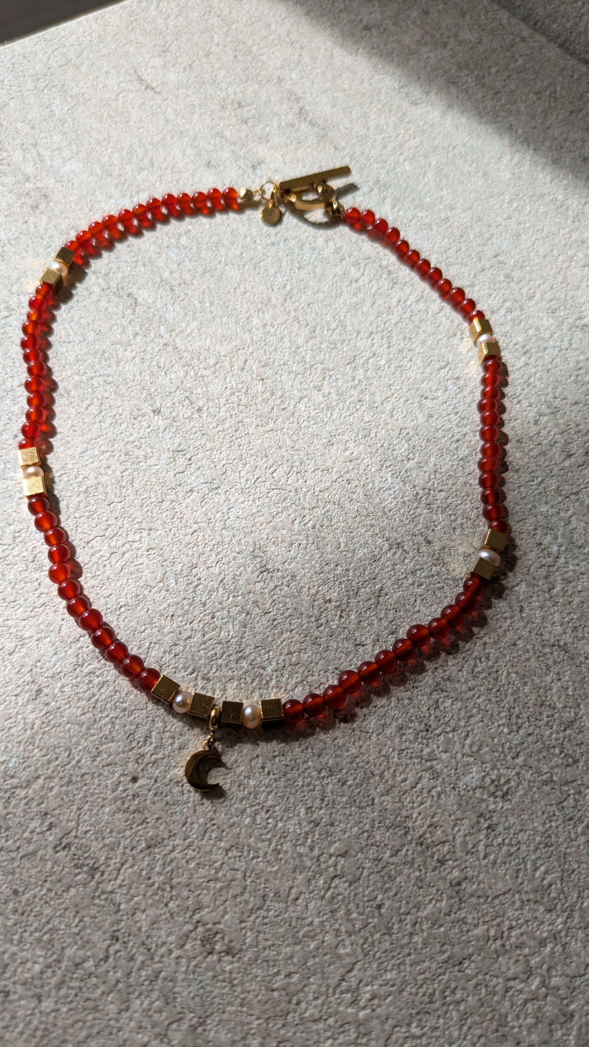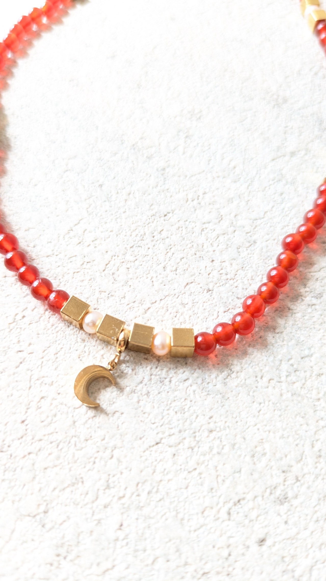 赤いカーネリアンとゴールドと淡水パールの白が絶妙な可愛さを醸し出しているチョーカーです