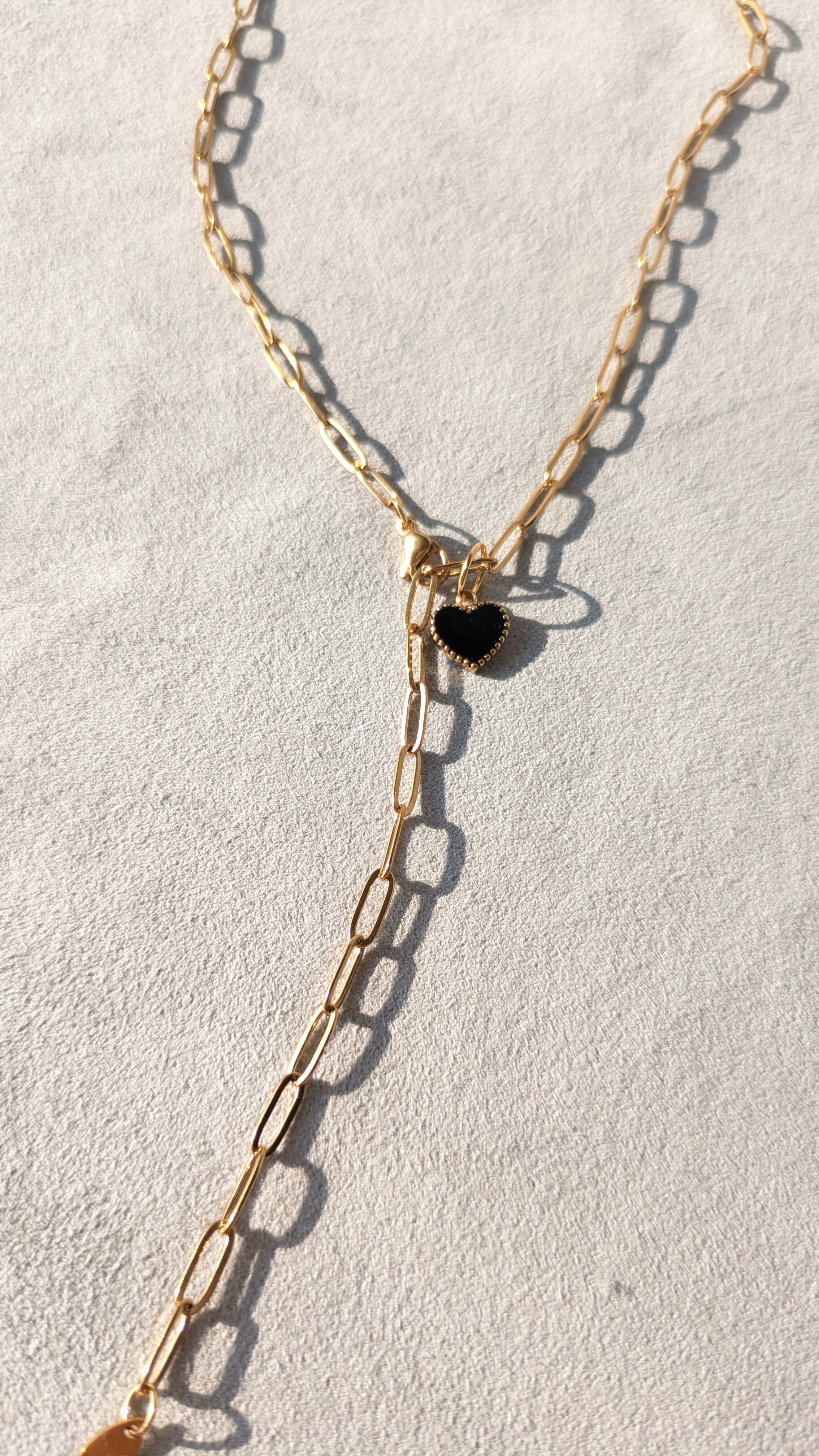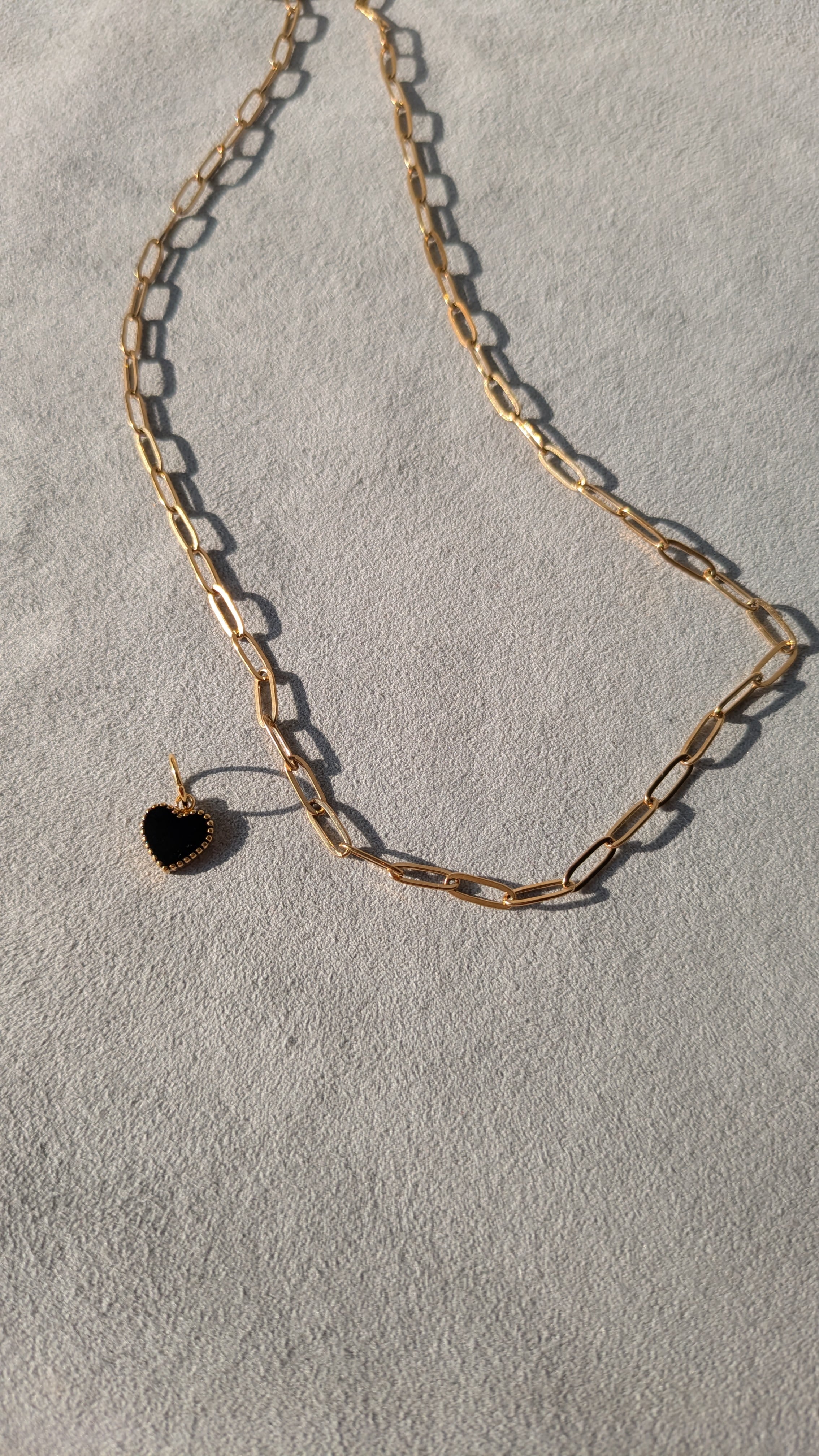 小さなブラックハートが輝きを放つ、ゴールドチェーンのネックレスです。ブラックとゴールドの上品な組み合わせが、大人っぽさと可愛らしさを絶妙に引き立てます。
